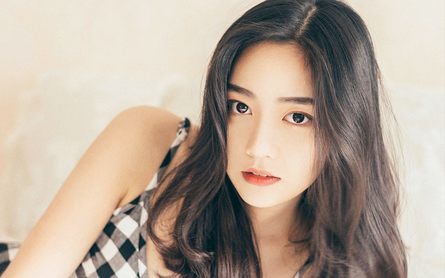 这个女人微低头,露出困惑的眼神,微微张开嘴,露出兴奋的表情。