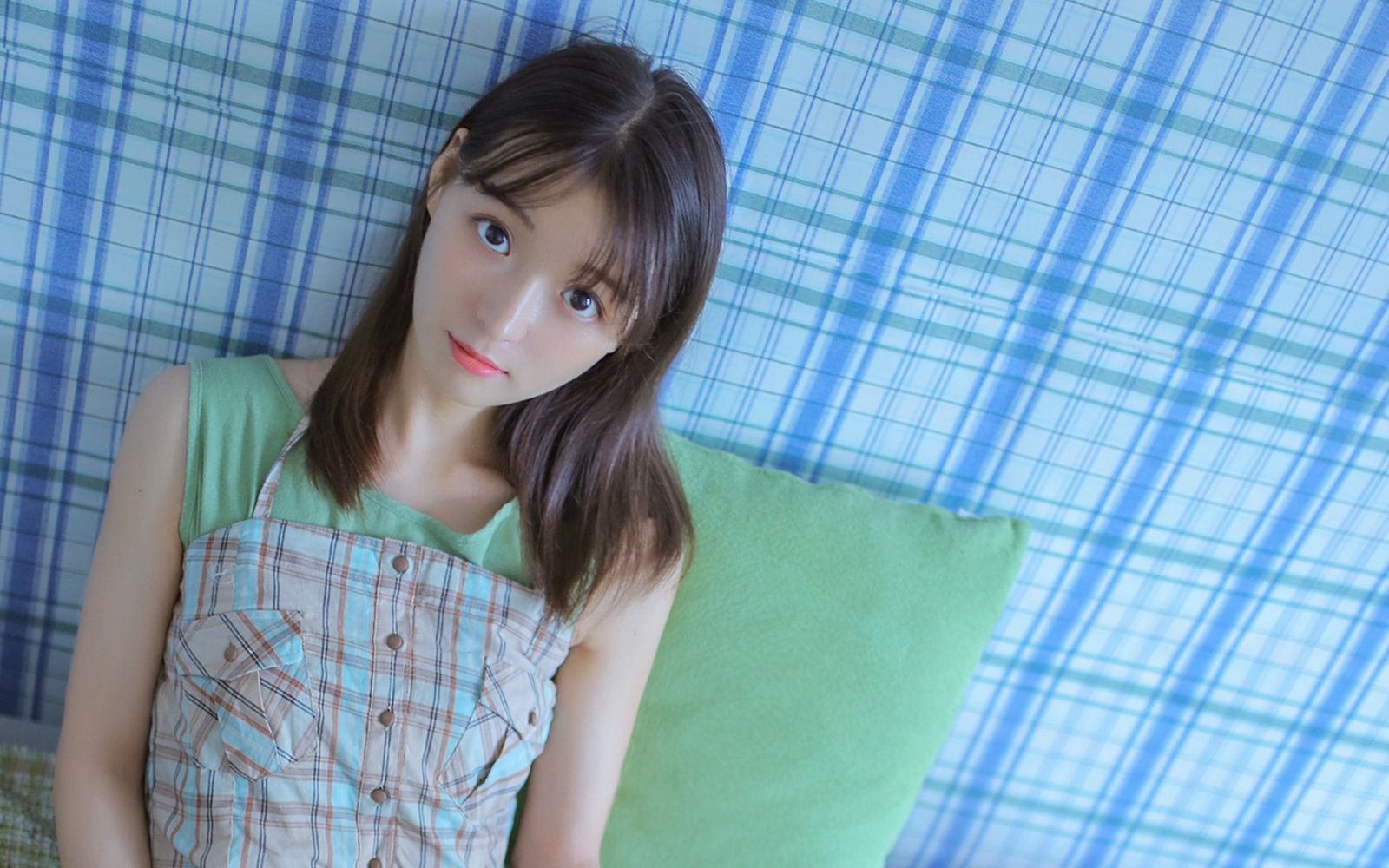 她穿着简单的吊带和运动短裤,微微冲着车窗的方向弯着腰。