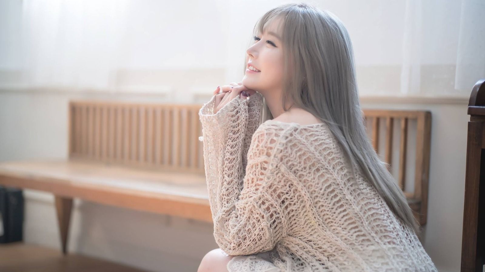 “右边的腿支在座椅上,转向我这个方向。”