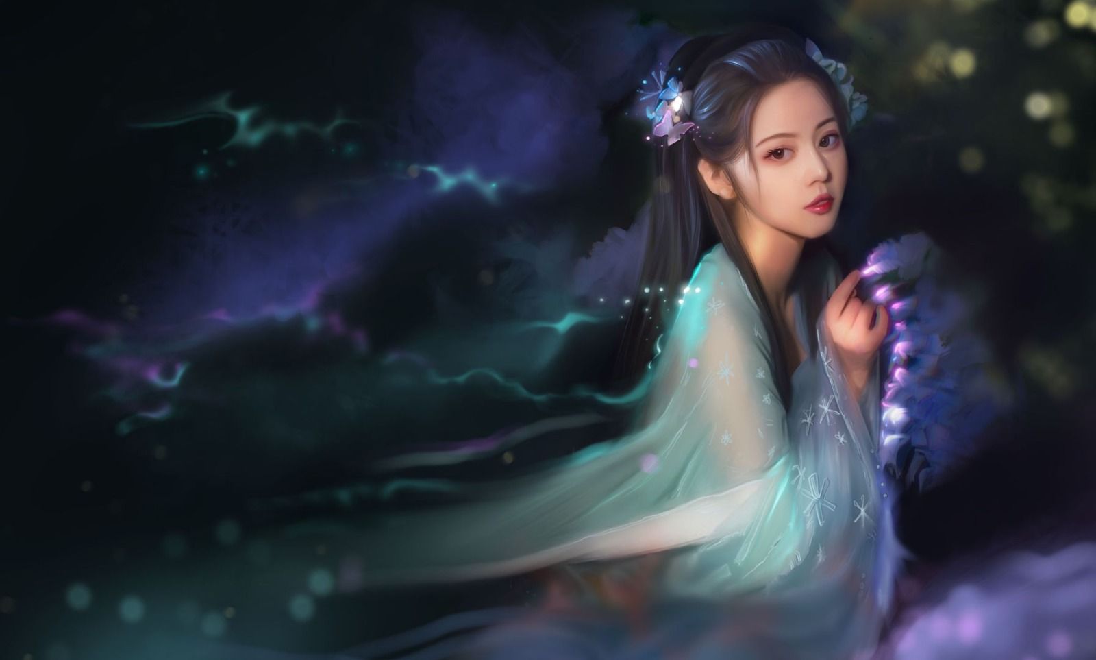 黑长柔亮的发披下来直到臀部,身材高挑却不单薄,有着孩童般的柔嫩和熟妇般的丰腴。美人一手搭在屏风上,一手轻轻点在脸颊上。