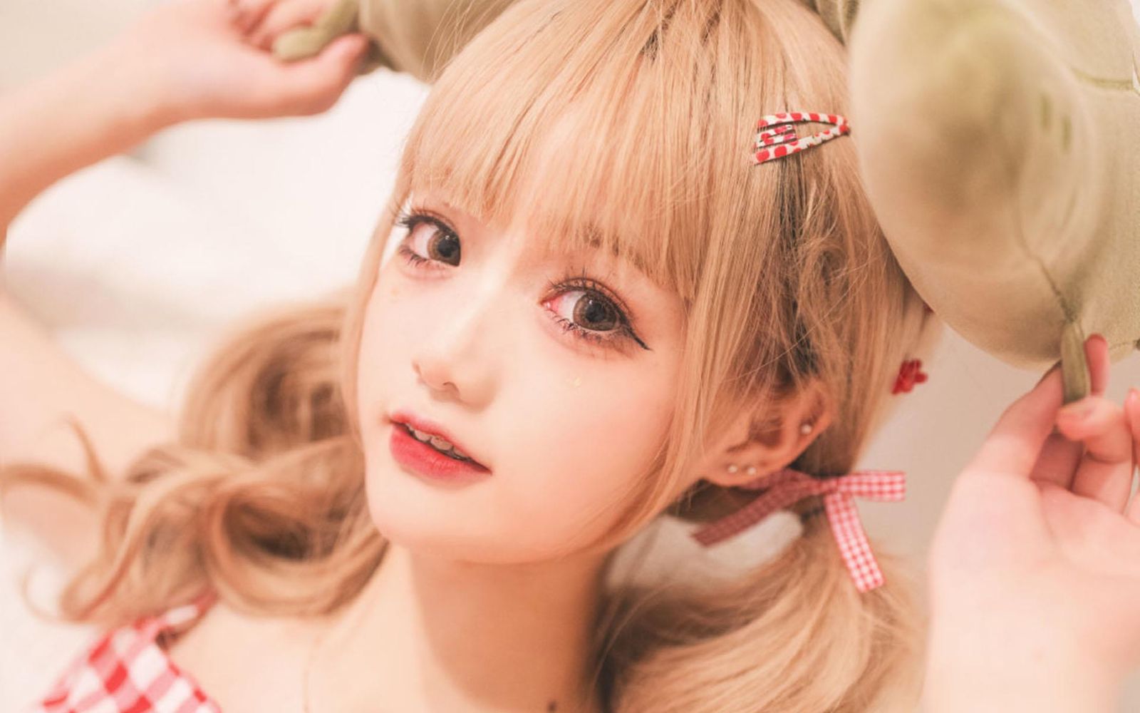 手肘撑着床垫坐了起来,撑着额头,金棕色的长发从两侧散乱垂下。
